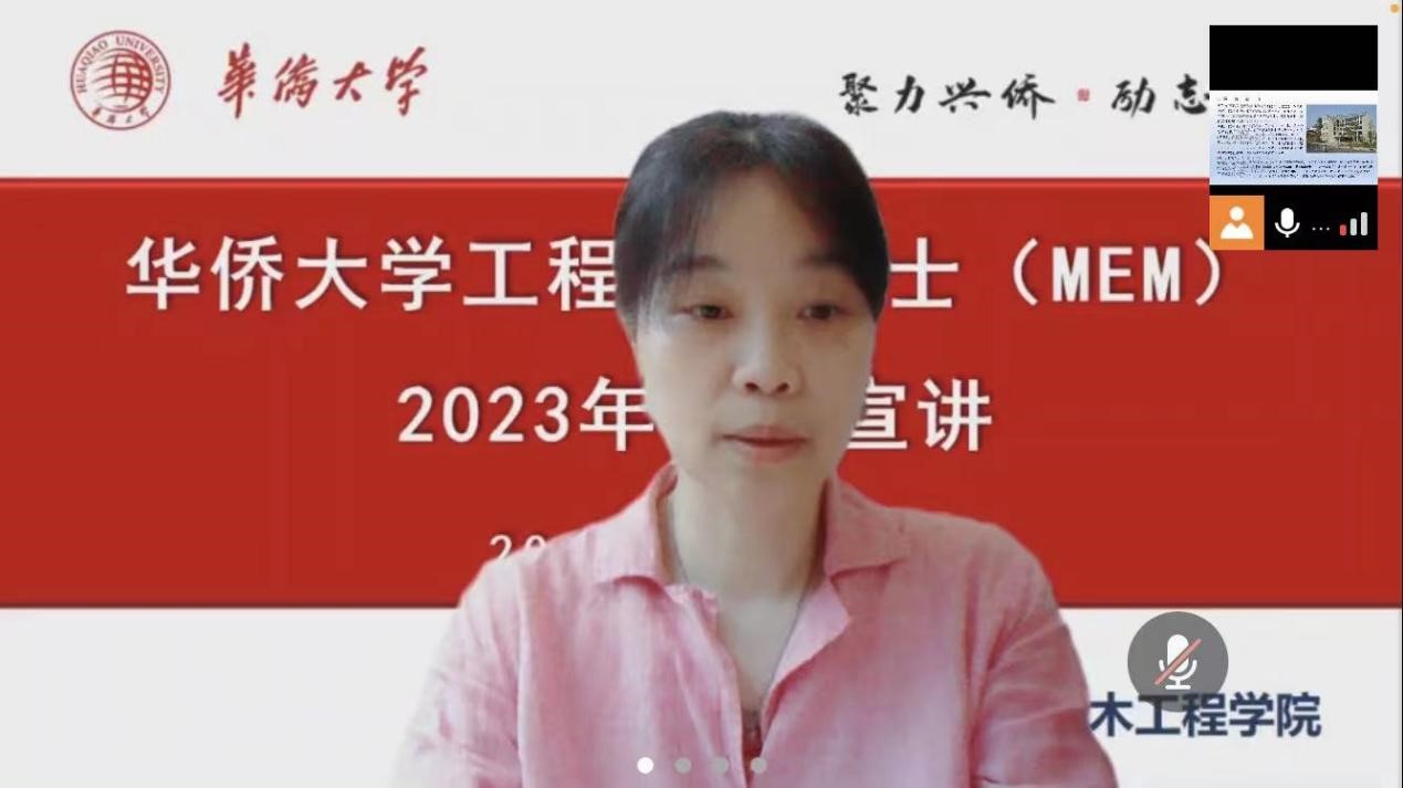 罗漪从办学历程、学科优势、专业特色等方面简要介绍了华侨大学、土木工程学院和MEM教育中心的概况和近年来的办学成果。她还详细介绍了MEM硕士研究生的招生对象及学制、报考条件、具体考试流程等方面内容,为考生提供全面、准确的招生信息。